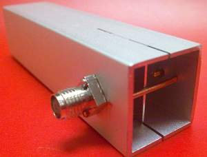 En este caso se le han instalado conectores SMA en ambos puertos. Se trata de conectores para soldar sobre PCB, pero han sido modificados para permitir su fijación mediante tornillos al cuerpo del guiaonda.