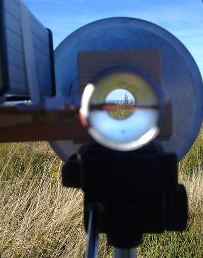 Lo siguiente fue realizar intentar el QSO con EA1BLA en 10GHz usando el transverter de Kronotek. Esta unidad es un prototipo y solo dispone de 60 mW en el transmisor y no esta optimizada la recepción. Y como somos muy mala gente, decidimos que se lo íbamos a poner muy difícil al transverter, así que el lugar de acoplarlo a la parábola, usamos una antena experimental guiaonda "cacharreo-made" a la que añadimos una bocina recuperada.