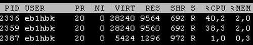 Esta es la carga del sistema sobre el Raspi con los dos servidores rtl_tcp activos, cada uno enviando el flujo de datos correspondiente a una anchura de espectro de 2 MHz (4 MHz en total):