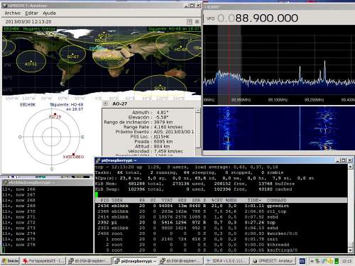 Es preciso indicar que, salvo el SDR#, todas las ventanas abiertas son aplicaciones que se están ejecutando en el Raspi a través de diferentes sesiones de SSH. Una de ellas (Gpredict) es una aplicación gráfica que estoy ejecutando de modo remoto sin necesidad de lanzar el entorno gráfico en el Raspberry.