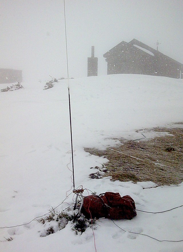 La banda de 40 estaba inutilizable debido al QRN, asi que no le dimos mucha vida a la Workman la cual, a los pocos segundos de colocarla, se había cubierto con una gruesa costra blanca. El primer QSO, un HB9 móvil en 20 metros, entró pronto en el log pero no así los siguientes ya que Marcos EB1WM se las vió y se las deseó para entresacarlos del ruido.