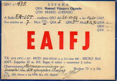 Tal vez sea esta la tarjeta QSL mas antigua que documenta la actividad de los primeros radioaficionados en la provincia de Orense. No voy a desvelar como llegó a mi encuentro esta tarjeta, lo que puedo asegurar es que la guardo casi con el mismo cariño que conservaría, salvando las lógicas distancias, una tablilla de la biblioteca de Asurbanipal.