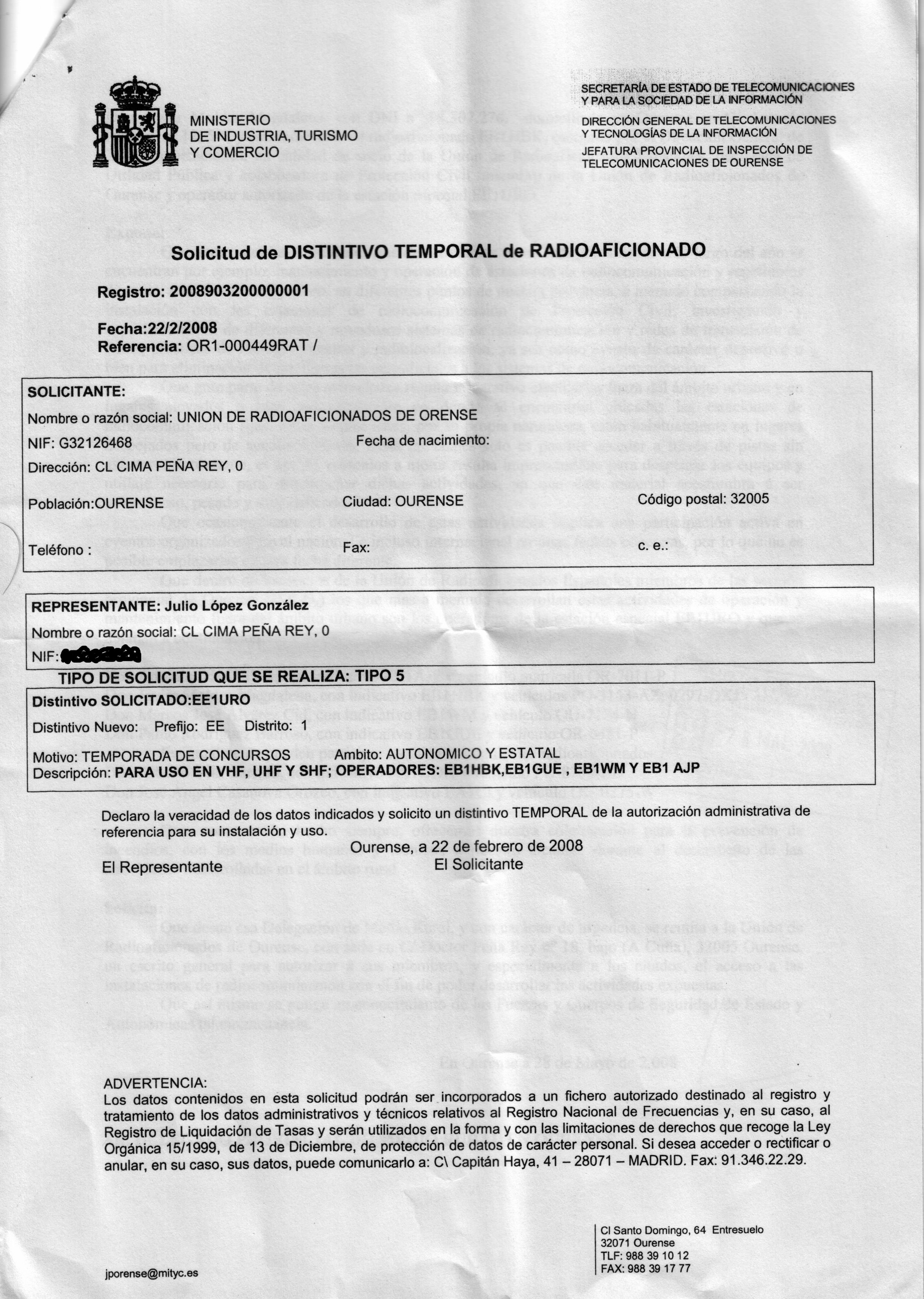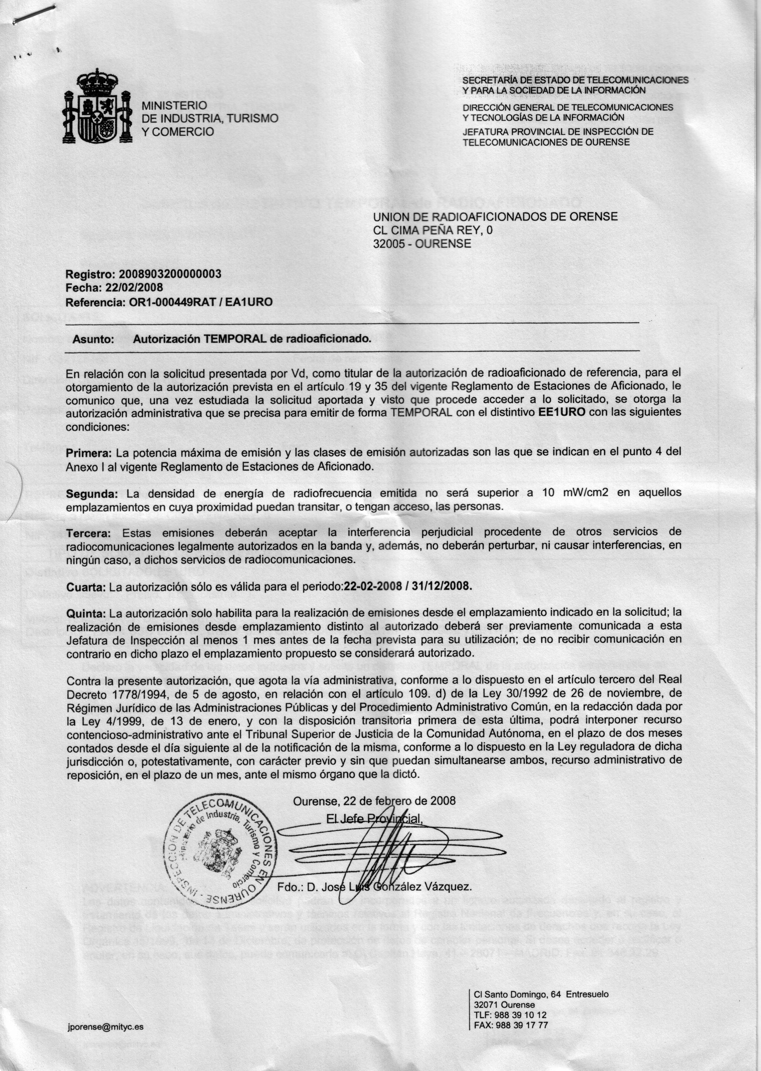 Para que non haxa suspicacias de ningún tipo, a continuación achegamos a documentación que nos habilita para levar a cabo esta actividade. Como podedes comprobar, solicitouse unha modificación da autorización temporal que nos permitiu operar toda a tempada de concursos nesta banda desde IN62GE. Como dicía unha canción (de 'No me pises que llevo chanclas'?