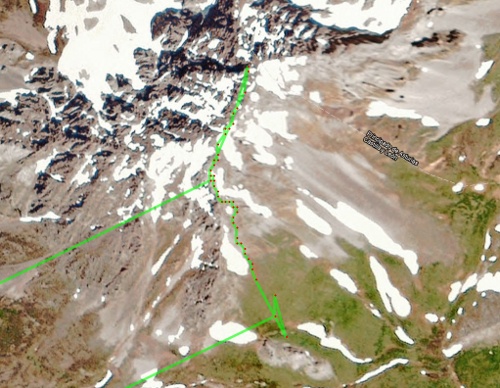 En las capturas del mapa de ARPS aparecen unas manchas blancas de nieve, pero no corresponden con el momento real de la ascensón. Ese día había muchísima mas.